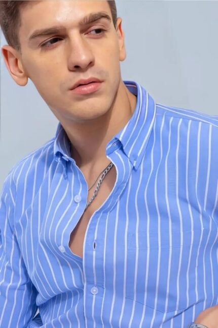 By Trezz Indian Style Smart Slim Fit Striped Cottan Peacock Blue Casual Mens Shirt