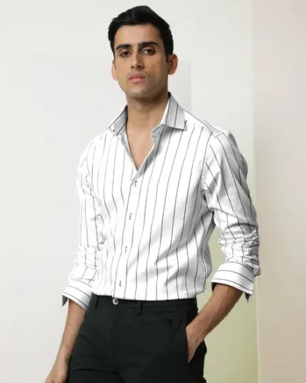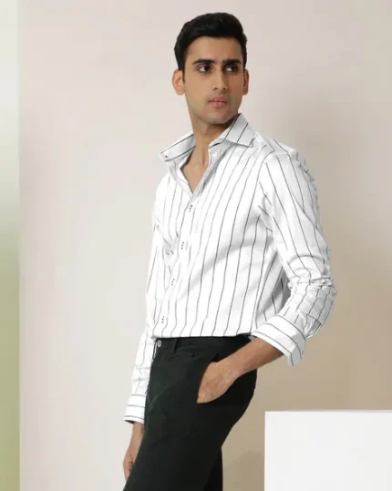Men Stripped Slim Fit Cotton White Shirt Blue Long Check